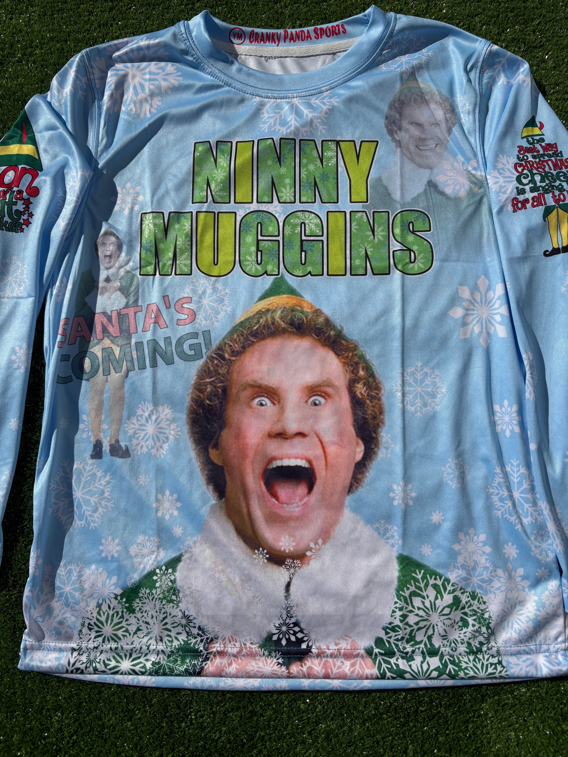 This Cranky Panda Buddy The Elf , NINNY MUGGINS Christmas Softball Jersey is constructed from lightweight, breathable poly dry fit fabric and uses full sublimation for a vibrant print that won't fade. Feel comfortable, confident, and proud wearing this jersey, which celebrates one of our favorite holidays!